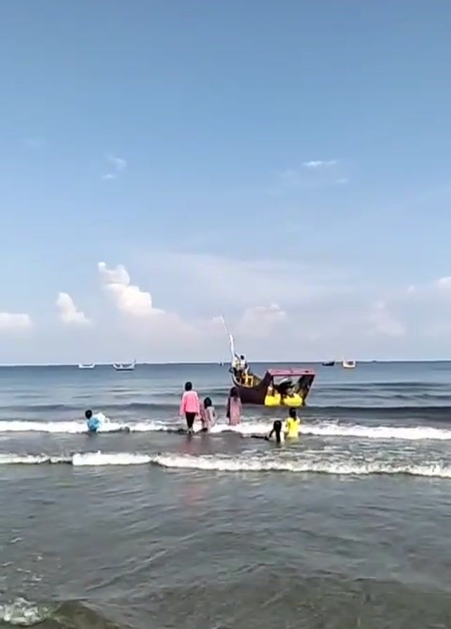 group of children playing in the shallow waters of a beach on a sunny day. The sky is blue with scattered white clouds. A colorful boat is anchored nearby, with a person standing on it. Other boats can be seen further out in the water. The children are wearing various colors and appear to be enjoying themselves in the gentle waves. The water is relatively calm, with small waves lapping at the shore. The scene conveys a peaceful and recreational atmosphere.