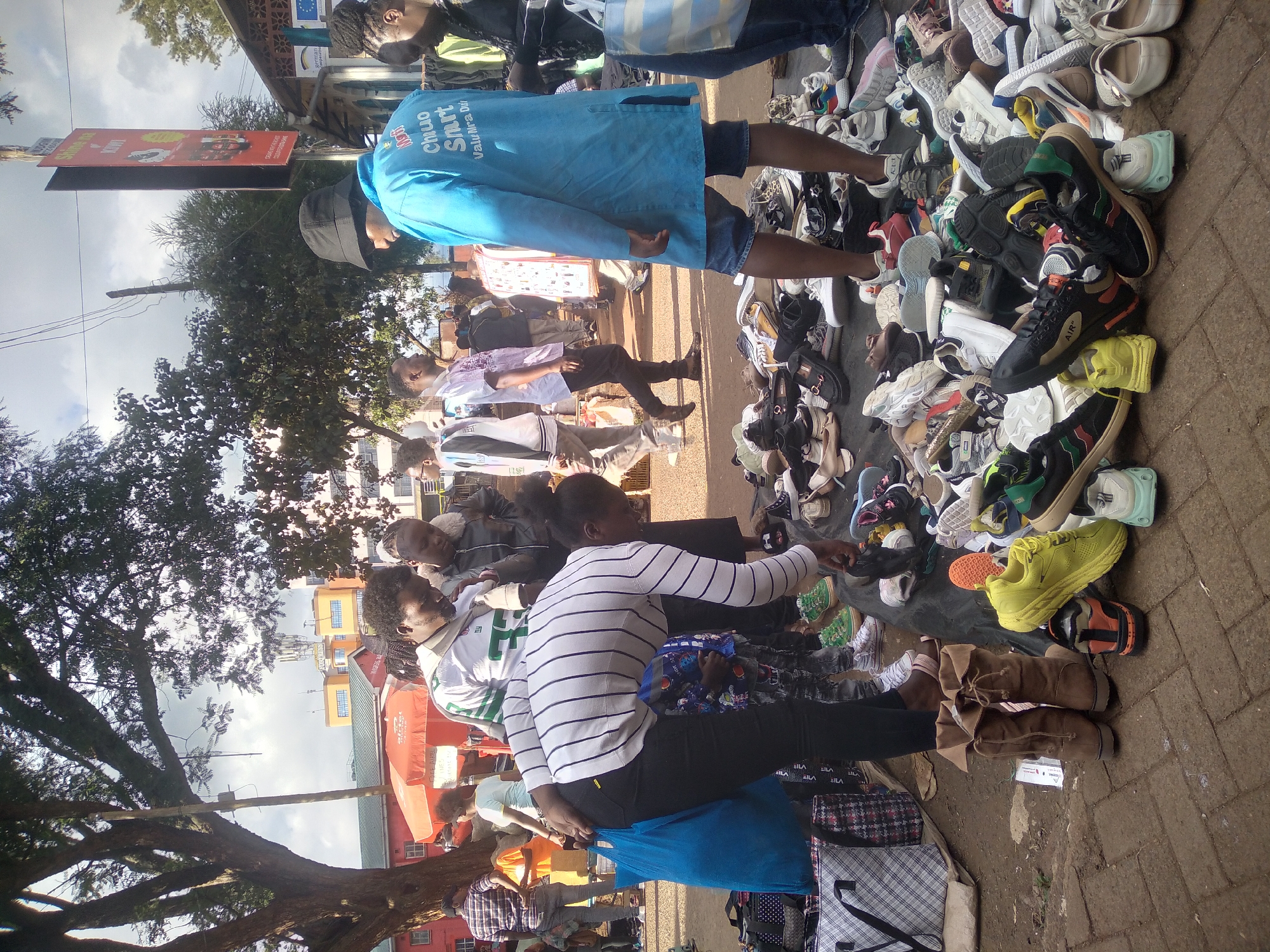 In the city of Nyeri, Kenya, a street vendor displays a large assortment of shoes on a gray cloth spread over a red brick sidewalk. Several customers, primarily young adults, are examining the footwear. The vendor, wearing a white and black striped shirt and black pants, interacts with a customer, pointing at a shoe. Another person stands close by, wearing a blue shirt with white lettering on the back. Trees provide shade from the sun, and buildings are visible in the background. Shoppers and passersby populate the street.