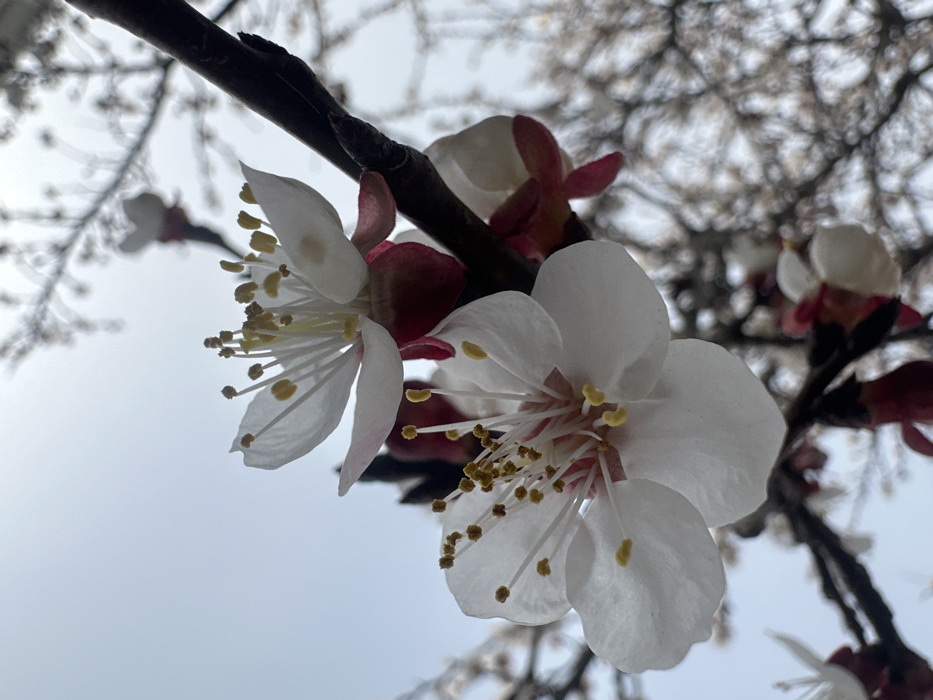 The scene presents a close-up, low-angle perspective of a flowering tree branch against an overcast sky in Plovdiv, Bulgaria. The primary subjects are two fully open blossoms in the foreground, each exhibiting five distinct white petals and a prominent cluster of numerous yellow-tipped anthers supported by white filaments. The base of each blossom features a reddish-pink calyx. A dark brown branch supports these flowers. In the blurred background, additional undeveloped buds and bare tree branches are visible against the diffused light of the grey sky. No human subjects, man-made objects, or specific actions are depicted.