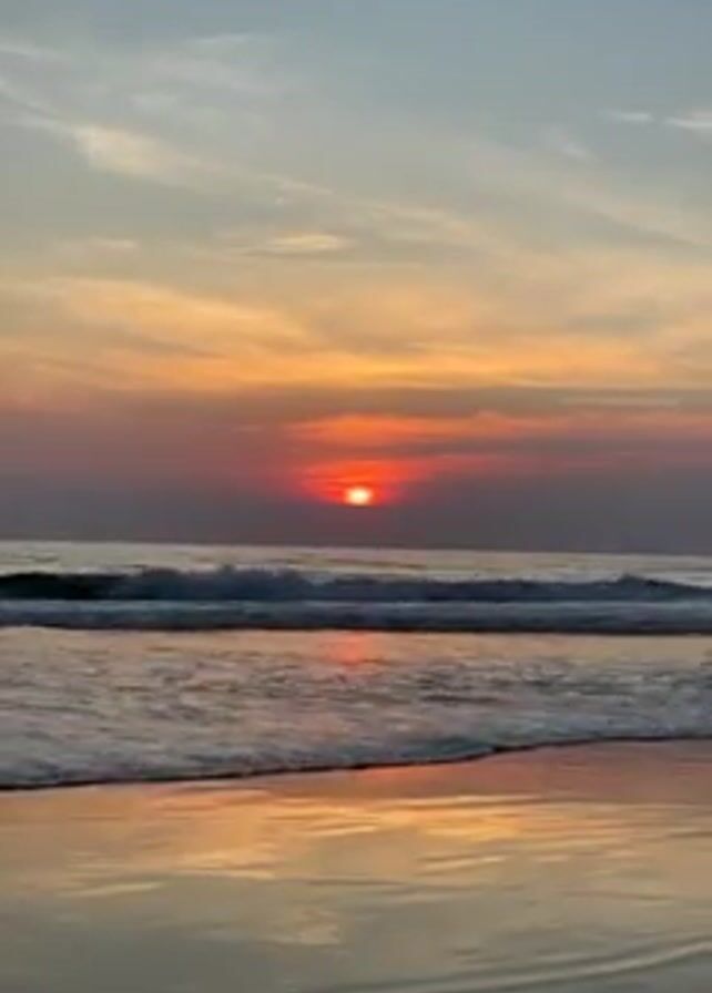 The scene is a beach at sunset