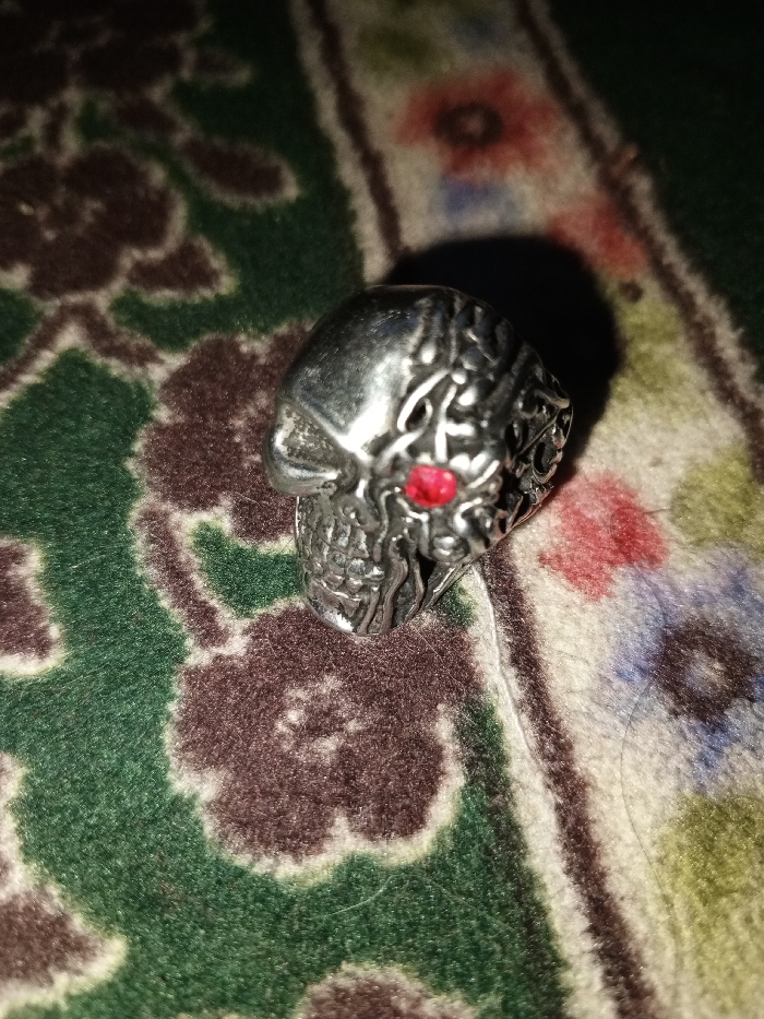 - "A silver skull ring with a red gemstone in the eye socket rests on a patterned rug" by FM-pltcW2, licensed under CC BY 4.0