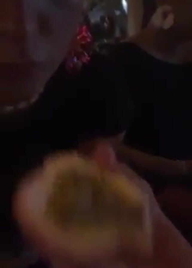 A woman with light skin, wearing dark clothing, a shell necklace, and bright pink earrings, holds a small pastry or sandwich up close to the camera and bites into it, widening her eyes. A second person is visible in the background. The scene appears to be indoors under a thatched roof.