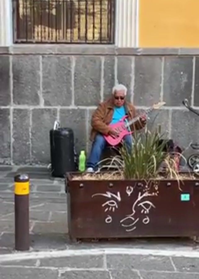 An elderly man with gray hair sits on the edge of a metal planter on a cobbled street, playing a bright pink electric guitar