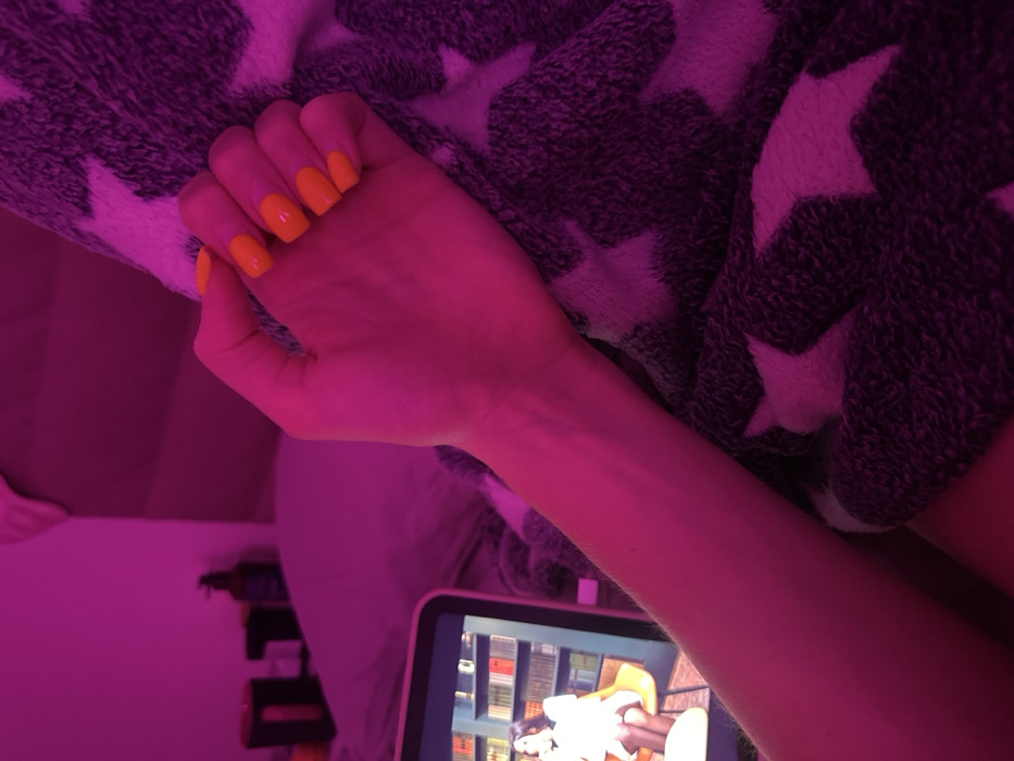 The scene is an indoor setting in Vsevolozhsk, Russia, heavily illuminated by magenta light. The foreground is dominated by a person's left arm, resting on a dark, plush blanket adorned with a repeating pattern of light-colored stars. The visible hand displays short, uniformly shaped fingernails painted with a bright, textured orange polish. In the lower-left corner, a digital device displays a video or show on its screen. The screen content depicts a light-skinned female with dark hair, wearing a white top and dark hosiery, seated on an orange chair, with a bookshelf filled with books visible behind her. The background, largely out of focus, reveals indistinct objects on a surface, including a dark pump-top bottle.