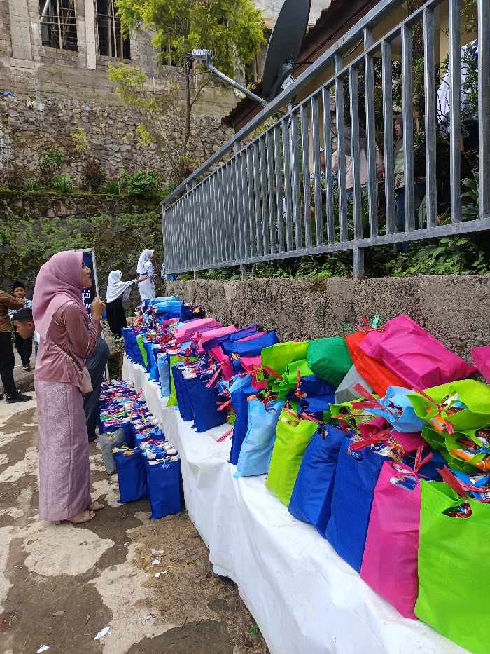 A long white table laden with colorful gift bags is set up outdoors, likely for an event or celebration. Predominantly blue, pink, and green bags filled with items are neatly arranged. Several individuals are present, including women in hijabs, some appearing to be distributing the gifts. The scene is set against a backdrop of a stone structure, vegetation, and a metal fence, suggesting a gathering in a public or semi-public outdoor space.