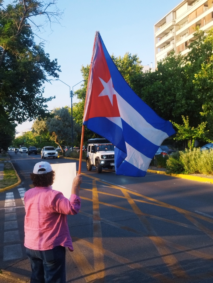 - "A woman stands in a street intersection holding a blank sign in her left hand and a Cuban flag in her right" by FM-ZqBmD2, licensed under CC BY 4.0
