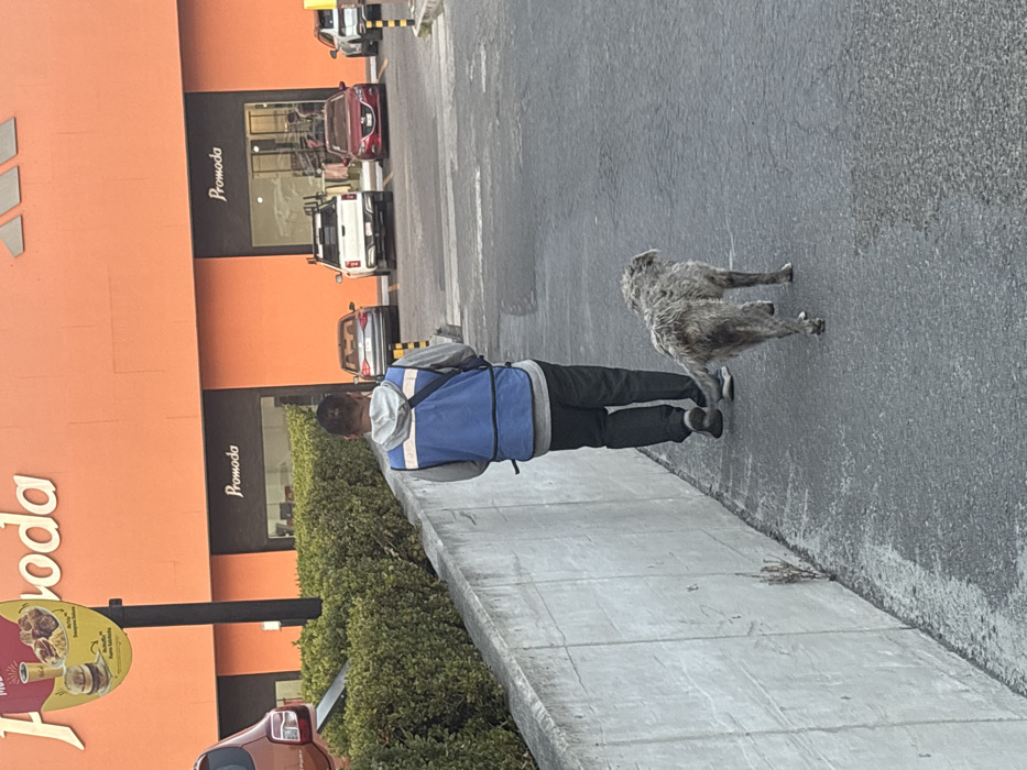 A man in a blue and gray reflective vest walks along a concrete path next to a hedge. A scraggly gray dog stands on the path near him. Behind the man is an orange building with the word "Promoda" printed on it. Parked cars are visible in the background. A sign with a picture of pastries is on the left.