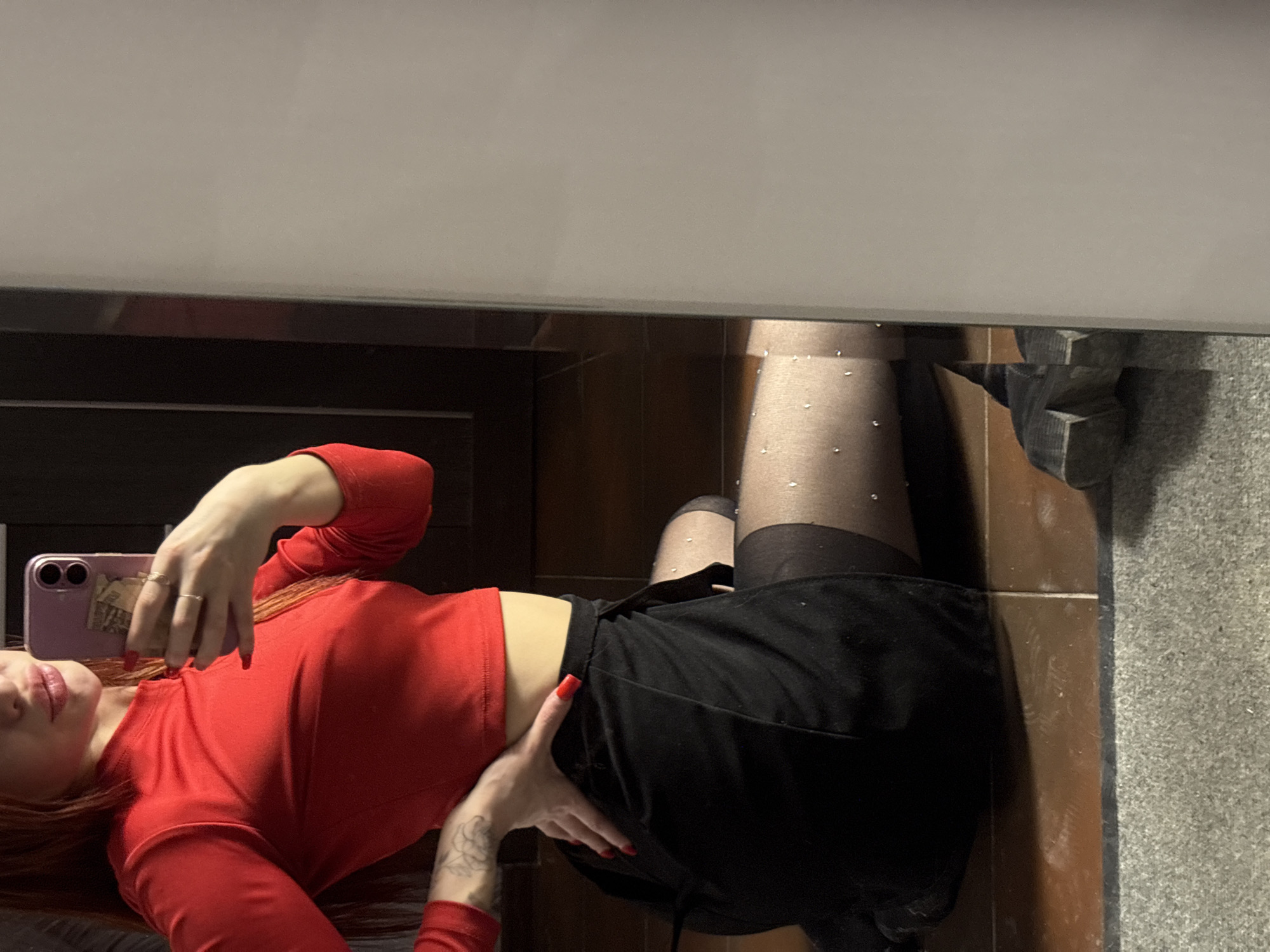 A red-haired woman in a red long-sleeved shirt, black skirt, and patterned stockings takes a selfie in a room with brown tiled flooring. Her red nails are visible. A mirror reflects her image. The location might be Simferopol, Ukraine.