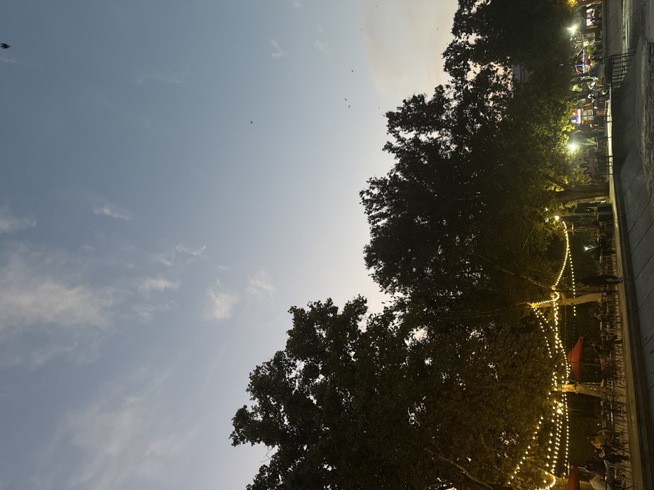 The scene depicts an outdoor urban environment at dusk or early evening, specifically identified as Swan Lake Park in the Kentron district of Yerevan, Armenia. The upper portion of the image shows a pale blue sky transitioning to a lighter shade near the horizon, with scattered, wispy white clouds and several small, dark birds in flight. The lower half of the frame is dominated by the dark, dense foliage of large deciduous trees, primarily bordering the left and right sides. Underneath the trees on the left, an outdoor dining area is established. This area features numerous tables and chairs, some covered by red umbrellas. The dining space is illuminated by multiple horizontal strands of yellow-toned string lights strung between tree trunks. Multiple individuals are seated at the tables, occupying the establishment. Their specific features, actions, and interactions are not discernible due to the low light conditions and distance. In the immediate foreground, from the center extending to the right, a concrete-lined body of water or canal is visible, appearing dark. Further down the tree-lined path on the right, additional artificial light sources and indistinct structures are faintly visible through the trees.