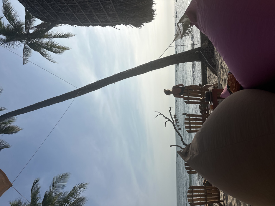 The scene depicts a beach environment in Thành phố Phan Thiết, Vietnam. A sandy beach occupies the foreground and midground, leading to a calm ocean under a light blue, partly cloudy sky. Numerous small fishing boats are visible on the water in the distance. In the immediate foreground, partially visible on the left, is a large, tan or light brown beanbag chair. A portion of a pink beanbag chair is visible on the right. Four wooden Adirondack-style chairs are arranged on the sand facing the ocean in the midground. A small, dark-colored wooden table with an unidentified dark container sits between two of these chairs. To the left of the chairs stands a gnarled, bare tree branch adorned with multiple spherical or shell-like hanging decorations. A single individual, a female, stands with her back to the camera, facing the ocean between two of the wooden chairs. She wears a dark, one-piece swimsuit and has light-colored hair secured in a bun. Her arms are down at her sides. Two tall palm trees frame the scene; one leans prominently from the center-right towards the upper left, while the fronds of another are visible in the upper left corner. A thatched-roof structure is partially visible on the far right, adjacent to the leaning palm tree. A woven hammock is strung between the leaning palm tree and an unseen anchor point to its right. The lighting suggests daylight, with a slightly hazy horizon over the ocean.
