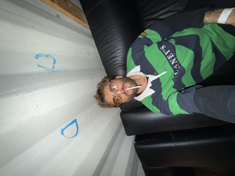 The image depicts a single male individual captured in a close-up selfie within an enclosed space. The man, with light brown, disheveled hair and a beard, is wearing tortoise-shell framed sunglasses with amber-tinted lenses. He is dressed in a green and navy blue horizontal-striped long-sleeve rugby shirt with a white collar, worn over a black long-sleeve undershirt. A "LANEY'S" logo is visible on the chest of the rugby shirt. A lit cigarette is held between his lips. A gold bracelet is visible on his right wrist, which is extended towards the camera, indicating he is holding the device. He is seated on a black, possibly leather or faux-leather, sofa or bench, portions of which are visible on the left and right sides. The background features a white, possibly corrugated metal or plastic, wall or ceiling panel with faint blue markings, including an incomplete oval shape on the left and a "U" shape on the right. A wooden beam is present in the upper right corner of the frame. The specific location within Lyon, France, cannot be determined from the visual information provided.