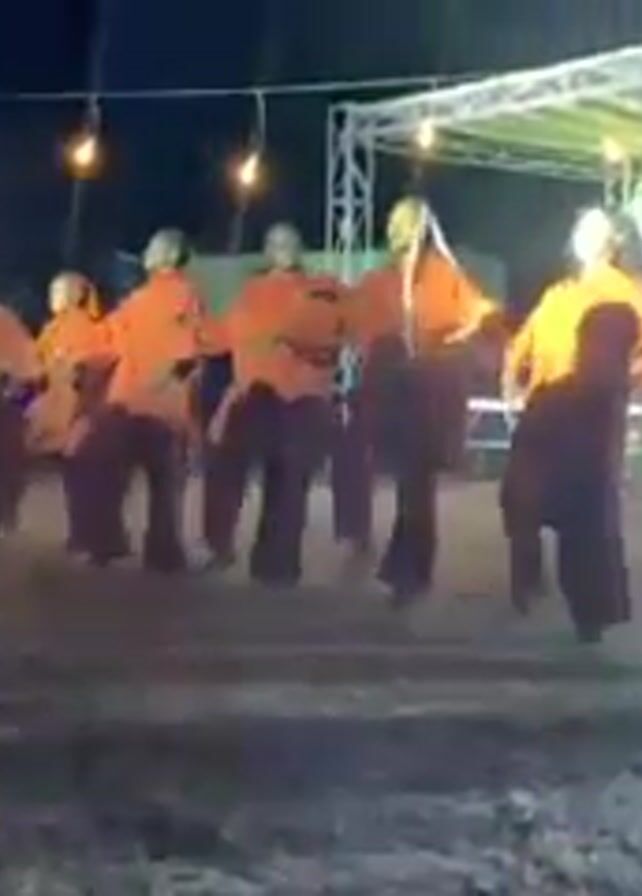 At night, a group of about a dozen people dance outdoors on uneven ground. They are arranged in a line and wear matching outfits, with orange shirts and darker pants. They move in unison, stepping and swinging their arms. A simple stage with a white canopy is in the background, illuminated by lights. There are some trees visible in the background as well, and the general lighting is dim with stage lights. The video is shot from a handheld camera and includes some lens flare.