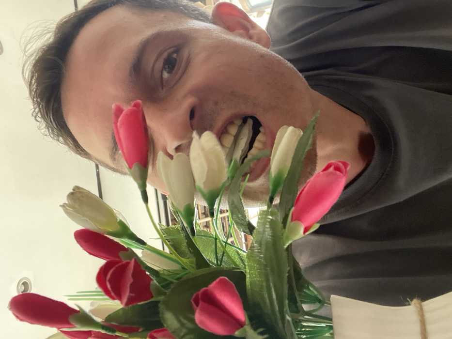 A close-up, tilted shot features a man holding a bouquet of artificial tulips, biting down on one of the white flowers. The flowers are predominantly red and white. The man's face, including his teeth and one eye, is prominently visible. He is wearing a dark gray shirt. The background appears to be indoors, and bright.