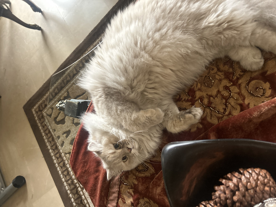 The image depicts an indoor scene within a residence located in Sarouja Municipality, Syria. A long-haired cat, exhibiting light cream-to-beige fur, is positioned centrally, lying on its left side with its belly partially exposed. Its front paws are tucked towards its chest, and its rear paws are extended. The cat's head is slightly raised and turned towards the viewer, revealing light-colored eyes and prominent white whiskers. The cat rests on a dark red or burnt orange velvet fabric adorned with intricate gold-colored embroidery in a floral and foliate pattern. This fabric drapes over a surface, which appears to be a glass-top table. On the table, to the lower left, a dark, square-shaped bowl or tray contains multiple brown pinecones. Behind the cat's head, on the glass surface, a small, dark decorative object resembling a statue with a lion's head motif is visible. A thin, light-colored cable extends across the glass surface in the upper right portion of the frame. Below the glass table, a patterned rug with dark brown borders and a lighter central area featuring an abstract design is present. In the upper left background, a silver-colored metallic furniture leg is partially visible. In the upper right background, a dark, ornate wooden furniture leg stands on a light-colored tiled floor. The scene is illuminated by ambient light, casting soft shadows.