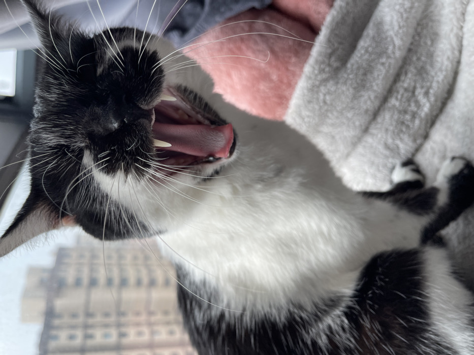 A black and white cat is yawning, its mouth wide open revealing a pink tongue and sharp teeth. The cat is laying on a gray and pink blanket. A city skyline is visible in the background through a window. The cat's fur is a mix of black and white, with black patches around its head and white fur on its chest. Long white whiskers jut out from its face. The cat's expression is one of extreme relaxation or boredom.