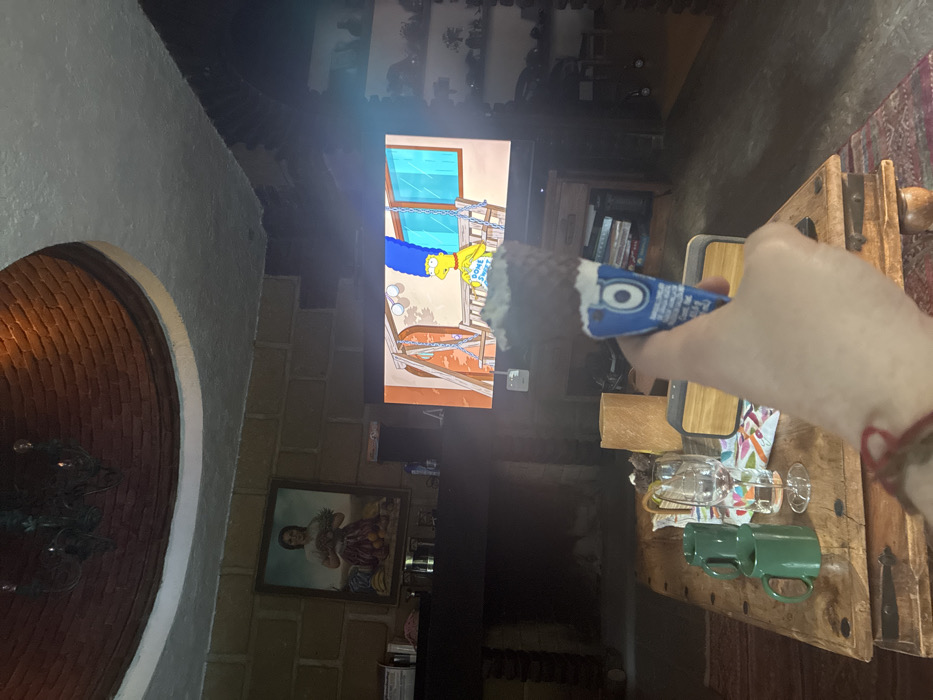 An individual holds an Oreo cone in front of a television. The screen displays a scene from "The Simpsons" featuring Marge Simpson in a bathtub. The setting appears to be an interior with textured walls and a rounded architectural feature. A framed painting hangs on the wall beneath the TV. A rustic wooden table holds glasses and green mugs.