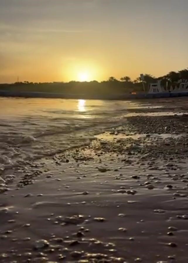 The video depicts a tranquil sunset on a beach. The sun, partially obscured by trees on the horizon, casts a warm, golden glow across the sky and water. Gentle waves lap against a shore composed of sand and small rocks. The water reflects the sunlight, creating a shimmering effect. A structure, possibly a dock or some recreational equipment, is visible on the shore to the right. No people are visible in the frame.