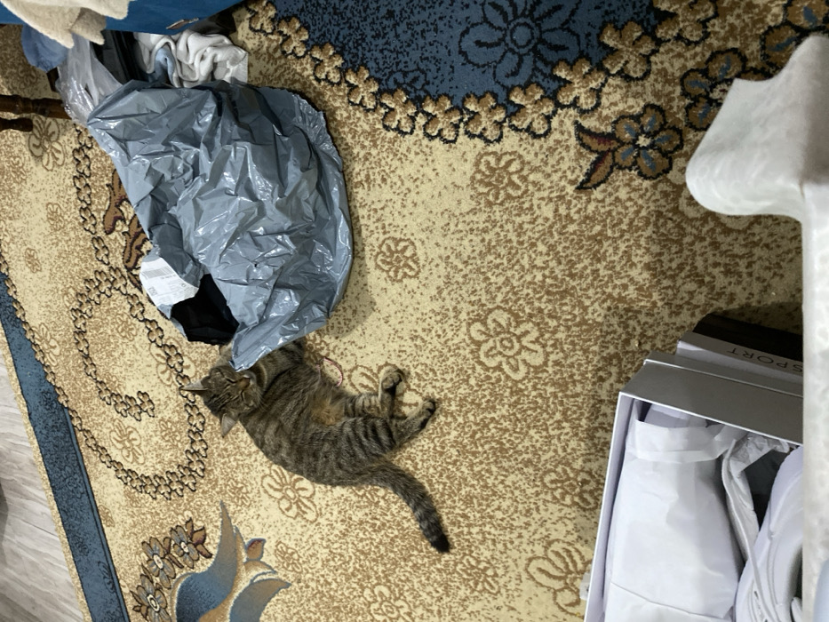 This image, taken in Sredkovets, Bulgaria, depicts an indoor residential scene. A brown and black tabby cat is lying on its left side on a patterned rug, facing right. Its head is resting against a crumpled, shiny grey plastic bag that appears to contain dark fabric and has a white label on its upper surface. The cat's front paws are near the bag. The rug is predominantly beige with brown speckles and repeating floral designs, bordered by a section of blue with similar patterns along the right and upper-left edges. In the lower left foreground, an open white shoebox is visible, containing white tissue paper and a white object, possibly a shoe, with "SPORT" printed on the box's side. In the upper right background, a dark wooden furniture leg and a pile of light-colored clothing items are partially visible, alongside a section of blue upholstered furniture.