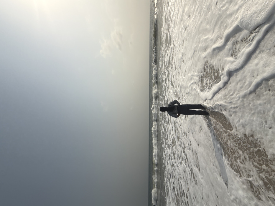A lone figure stands in the surf on a beach. The person is wearing dark clothing and faces away from the viewer. Foamy waves wash around their legs, creating a long shadow in the sand. The ocean stretches to the horizon under a hazy sky, which transitions from a dark grey near the bottom of the image to a lighter tone near the top. The photo is rotated so the horizon line runs vertically.