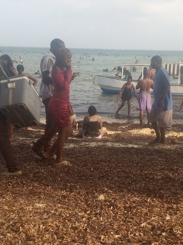 This image captures a busy daytime beach scene in Shanzu ward, Kenya. The foreground consists of a sandy shore densely covered with dark brown, dried organic plant matter. On the left, partially visible, an individual carries a large, light-grey cooler box. Adjacent to this, a dark-skinned male in a light-colored collared shirt and dark trousers walks towards the right. Beside him, a dark-skinned female with braids, wearing a long-sleeved red dress and light-colored sandals, also moves right. She appears to be holding a small object or bag near her hip. In the mid-ground, a dark-skinned female, wearing a dark top and light-colored bottoms, is seated on the debris-covered sand with her back to the camera, facing the ocean. Closer to the water, a dark-skinned male in purple shorts stands in the shallow water. To his left, a dark-skinned female in a dark swimsuit stands in the water, looking downwards. Further right, a dark-skinned male in a blue t-shirt and light-colored shorts stands on the beach, facing left. A light-colored, spherical object rests near his feet. In the background, the calm ocean extends outwards. A white boat with a blue stripe along its hull is partially submerged in the shallow water, tethered near the shore. Numerous individuals are visible in the water, engaged in swimming and wading activities. The horizon separates the water from a bright, light-colored sky.