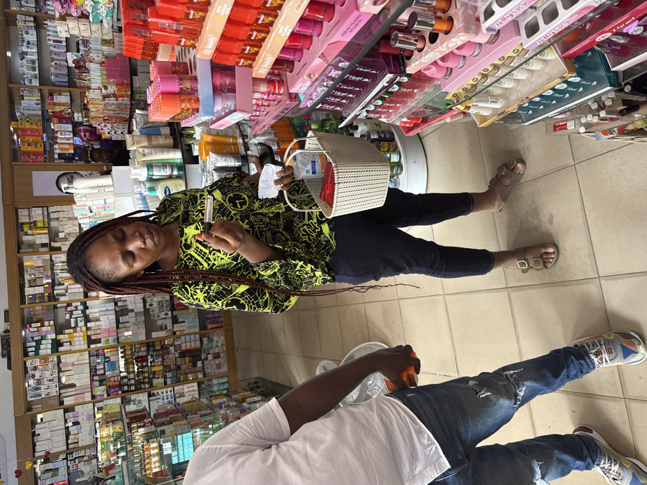 The image depicts an interior view of a retail establishment, identified as a pharmacy or cosmetic store, located in Galadimawa, Nigeria