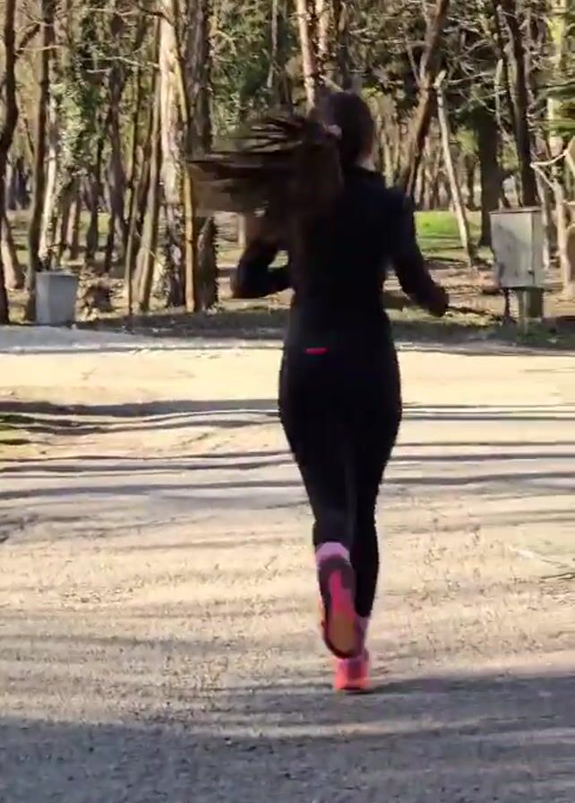 A woman runs on a dirt path through a grove of trees. The woman is wearing a black jacket, black leggings, and pink and orange athletic shoes with pink socks. Her hair is pulled back in a ponytail and she is running away from the camera. Sunlight dapples the path and the trees surrounding it. There are bare trees without leaves, and some low green bushes. There are trash containers on the side of the path as well.