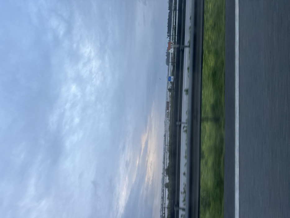 The image depicts a static scene captured from a moving vehicle on a highway adjacent to the Ria de Aveiro in Aveiro, Portugal. The lower portion of the frame presents the dark asphalt of a road with a solid white line on the left, both displaying significant motion blur indicative of forward movement. Immediately above the road, a two-tiered silver metal guardrail traverses the width of the image, backed by a strip of motion-blurred green grass. Beyond the guardrail, the expansive, placid waters of the Ria de Aveiro stretch horizontally across the mid-ground, dotted with small landmasses and sparse dark vegetation. Distant structures include a white building with a distinct orange-tiled roof positioned on the far right bank of the water. To its left, a small blue rectangular sign stands near the water's edge, and further left, a dark brown, box-like structure is discernible. The upper two-thirds of the image are dominated by an overcast sky, characterized by textured grey and light blue clouds, with a subtle lighter hue near the western horizon. No human figures or active interactions are observable within the frame.