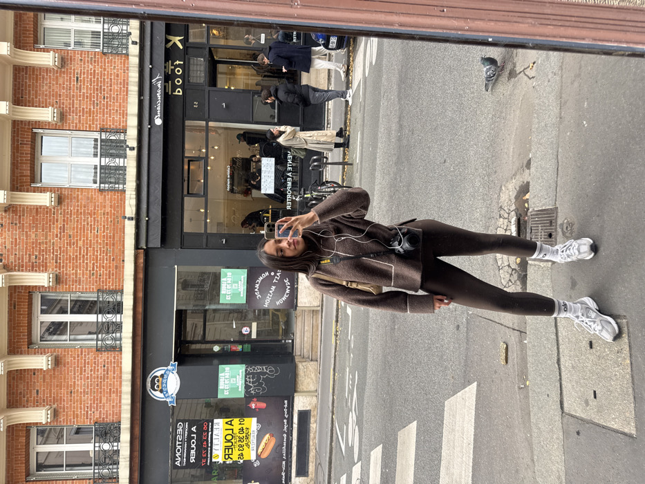 The image depicts a mirror selfie of a young adult female taken on a street in Paris, France, specifically reflecting the area near **20 Rue Réaumur, 75003 Paris**. The subject stands centrally, holding a light-colored smartphone to capture her reflection. She has dark hair and is dressed in a brown, high-collared, textured pullover with light-colored trim details on the cuffs and hem, paired with matching brown leggings. She wears white athletic socks bearing a dark logo and light grey and white athletic sneakers. White wired earphones are visible, extending from her ears. A black camera hangs around her neck by a strap, and a beige shoulder bag is slung over her left shoulder. The background, captured in the reflection, displays a Parisian street scene. The immediate foreground shows grey pavement and a section of a white pedestrian crossing. On the pavement to the bottom right, a pigeon is visible. Across the street, a multi-story building features a red brick facade with three sets of tall, white-framed windows, each equipped with a black wrought-iron Juliet balcony, separated by white pilasters. At ground level, two commercial establishments are present. The shop on the right has a black facade with white lettering indicating "K food" and "boot K," identifying it as a Korean restaurant. Patrons are visible inside through its glass windows. The adjacent shop to the left, also with a black facade, appears vacant or "À LOUER" (for rent), displaying various reflected French posters including "A LOUER," "GESTIONS," "REALITY," a hot dog graphic, and "Pitzza Factory." Several other pedestrians are visible on the opposite sidewalk. A parked bicycle stands near the entrance of the "Boot K" restaurant, and a blue vehicle is partially visible on the far right. The scene is illuminated by ambient daylight.