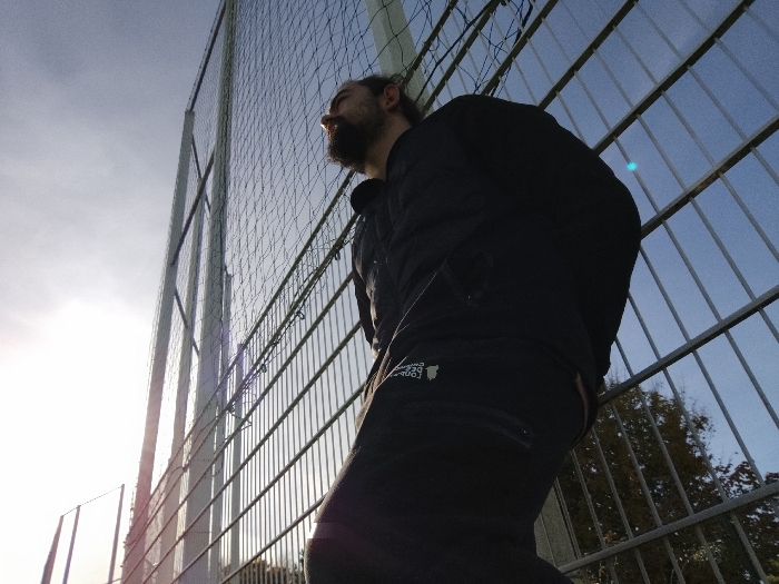The image captures a male individual standing outdoors in Schiltigheim, France, positioned from a low angle against a tall metal perimeter fence