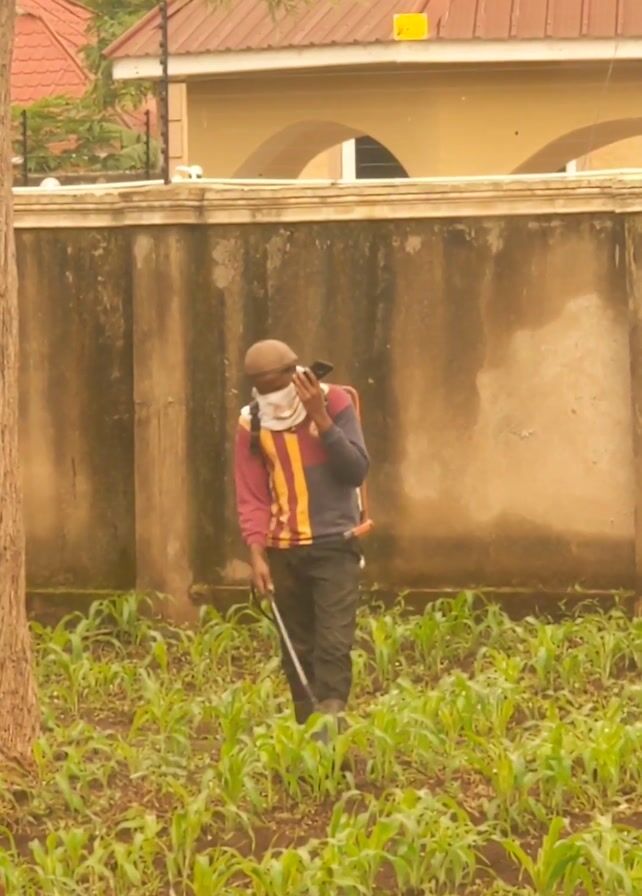 A man sprays crops in a small field next to a tan wall. He wears a hat, a white face covering, a long-sleeved shirt, dark pants, and boots. He has a backpack sprayer and is using a wand to spray the plants. The plants are green and appear to be young corn. Behind the wall is a building with a brown roof. The sky is overcast.