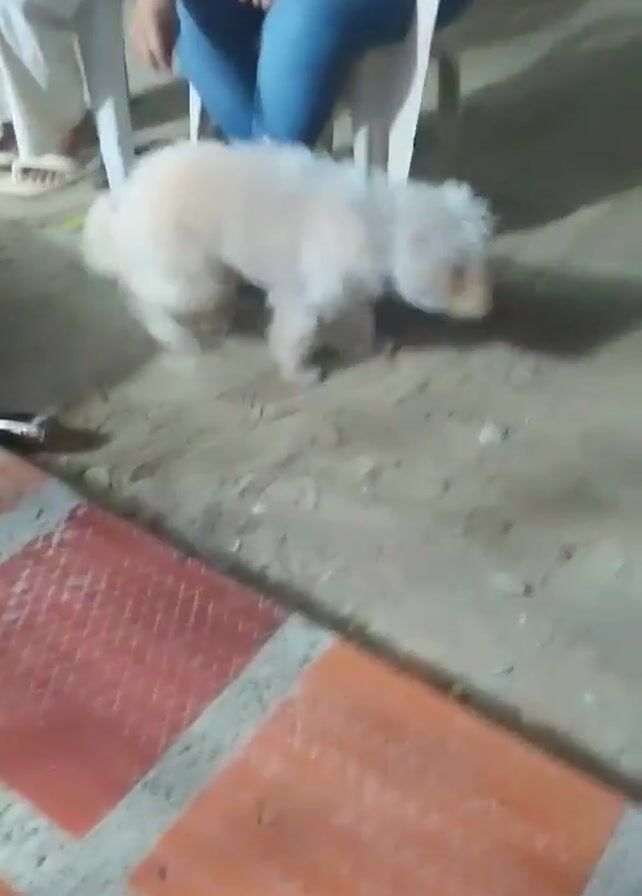 small, fluffy white dog walking on a concrete surface. A person wearing blue jeans and a white shirt is seated nearby, patting the dog. Another person, wearing a white shirt and jeans, walks towards a gated doorway in the background. The video appears to be taken outdoors, at night, with some lighting present. There are some red and gray tiles on the bottom left of the frame.
