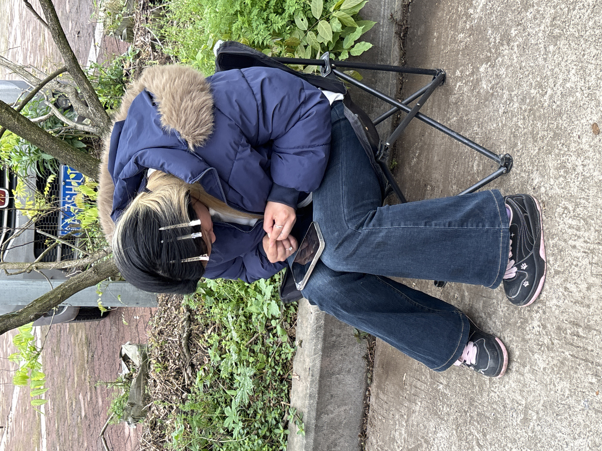 A person sits in a black folding chair outdoors in Xianfeng, China. The person wears dark blue jeans, black athletic shoes with pink laces, and a dark blue winter coat with a fur-trimmed hood. Their hair is styled with blonde bangs and black hair pulled back with clips. They are holding a cell phone in their hands. The ground is concrete. Vegetation is visible in the background. Part of a vehicle is visible on the left edge of the image.