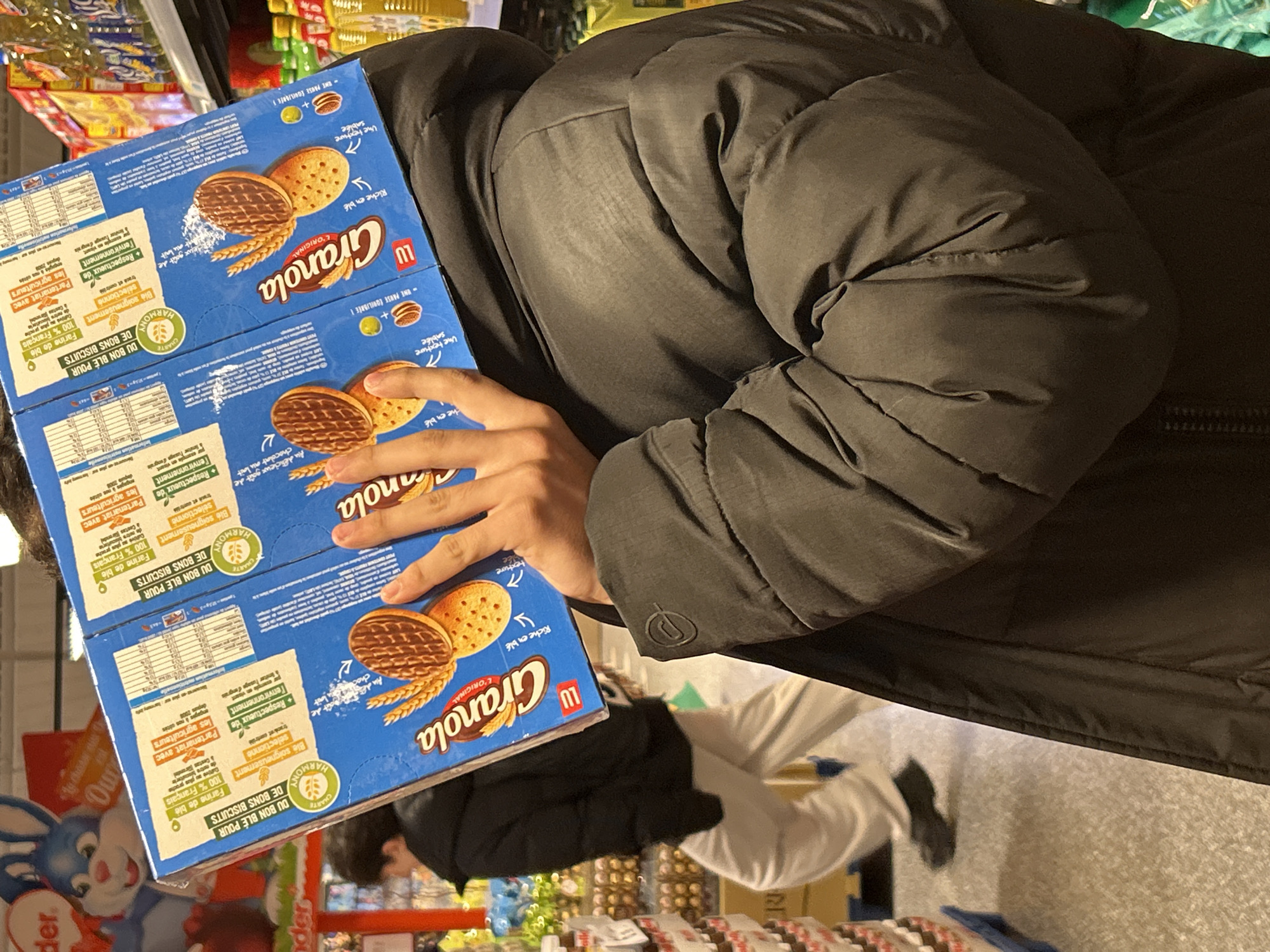 A person wearing a black puffer jacket and white trousers is holding three boxes of "Granola" biscuits in a store aisle. The boxes are blue with images of the biscuits and French text. Shelves of other products are visible in the background, suggesting a supermarket setting. The orientation of the image is rotated, with the person appearing on their side. No explicit mention of the city of Strasbourg is visible in the image.