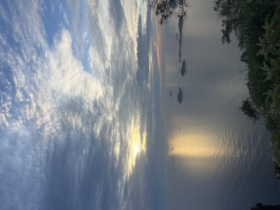 An elevated, panoramic view captures a coastal seascape during sunrise or sunset from a high vantage point in Rio de Janeiro, Brazil, likely from Sugarloaf Mountain (Pão de Açúcar) overlooking the Atlantic Ocean. The scene includes the Ilhas Cagarras archipelago in the mid-distance. The sky, occupying approximately the top half of the image, features extensive stratocumulus and altocumulus cloud formations, with patches of lighter blue visible. The sun, partially obscured by clouds on the left-center horizon, emits a strong golden light. The vast expanse of the Atlantic Ocean fills the lower mid-ground. An intense, elongated golden reflection of the sun is visible on the water, stretching from the horizon towards the foreground. Numerous small, dark, vegetated islands are scattered across the mid-distance of the ocean, predominantly on the right side. Several dark, indistinct cargo ships or tankers are present on the distant water. The immediate foreground, at the bottom of the image, consists of the dark edge of a cliff or mountain, covered with green scrub vegetation, including grasses and small plants. On the far lower left, a partial view of one individual is visible, their back to the viewer, appearing to observe the ocean. No specific actions or interactions are discernible beyond observation.