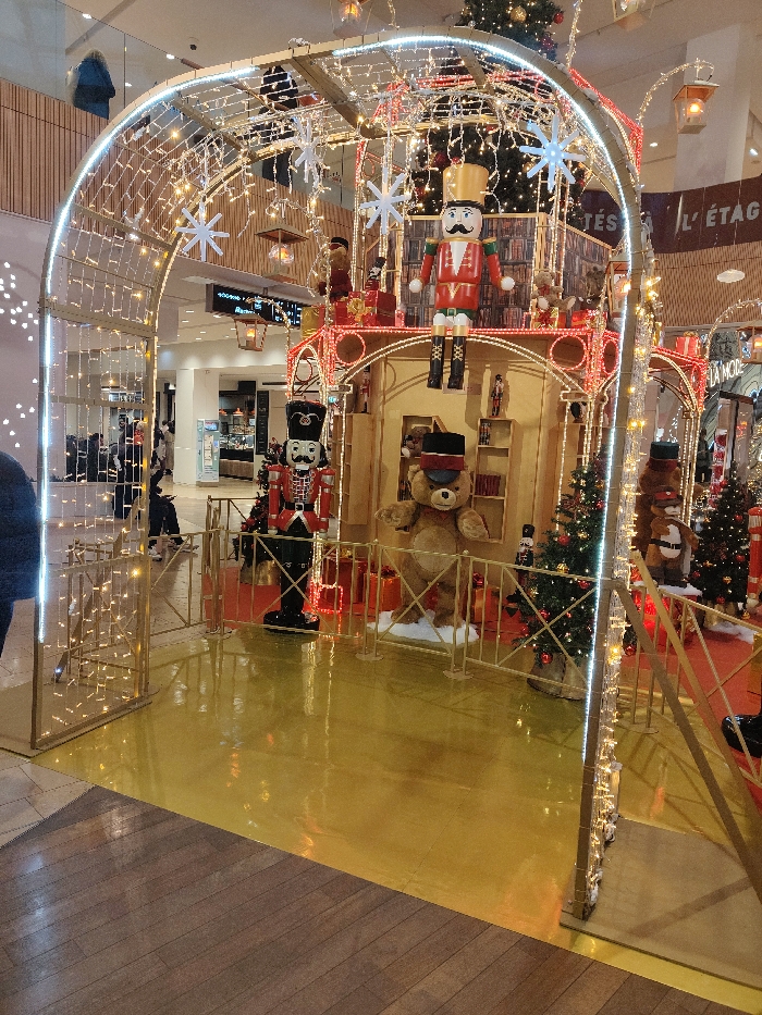 This image captures a festive holiday display situated within a modern shopping mall in Strasbourg, France
