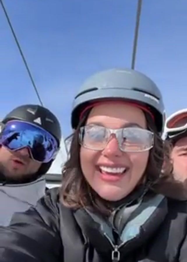 Three people are on a ski lift on a sunny day with snow-covered mountains. The person recording is a woman in the center, wearing a gray helmet and light-tinted glasses, smiling and looking at the camera. To her left is a man with dark hair wearing a black helmet and reflective goggles. To her right is a man wearing white goggles and a light-colored helmet. The background shows a snowy mountain landscape and other ski lifts. They are whooping and excited.