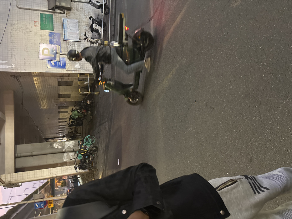 An urban street scene unfolds at dusk or night in Yuexiu District, China, beneath an elevated road structure. In the immediate foreground on the left, the lower torso and left arm of an individual are partially visible, clad in a black long-sleeved garment and grey sweatpants featuring a zippered pocket and dark vertical patterns. The individual appears stationary. Mid-ground to the right, a person wearing a dark helmet, dark jacket, and light-colored pants operates a dark-colored electric scooter, traveling from right to left across the frame. The scooter exhibits motion blur, a glowing display on the handlebars, and a rectangular cargo attachment on its rear. The background reveals a concrete underpass environment. Large, light-colored concrete pillars support the elevated roadway overhead. Along the right side, a light-tiled or painted wall runs parallel to the street, displaying multiple signs including a blue "P" for parking, other blue and green signs with Chinese characters (e.g., indicating parking restrictions), and several light fixtures. Underneath the elevated structure and against this wall, an informal parking area houses numerous parked electric scooters, some white, some dark, alongside distinctive teal and green shared bicycles. One individual is discernible walking or standing in this dimly lit parking area. The ground surface is dark asphalt with faint yellow road markings. A security camera symbol is visible on a sign attached to the elevated structure in the upper left background.