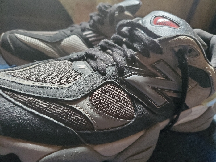 - "A pair of New Balance 990v2 athletic shoes, primarily dark grey/black suede and mesh with lighter grey accents and white midsoles, rests on a dark blue textured surface" by FM-srCA33, licensed under CC BY 4.0