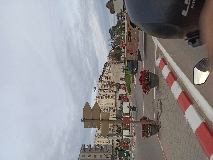 A street scene from a motorcycle's perspective, showing a road with red and white barriers. A traffic light stands nearby. Buildings line the street, and a car is parked alongside a grassy area with red flowers in planters. A motorcycle is further down the road. The sky is overcast.