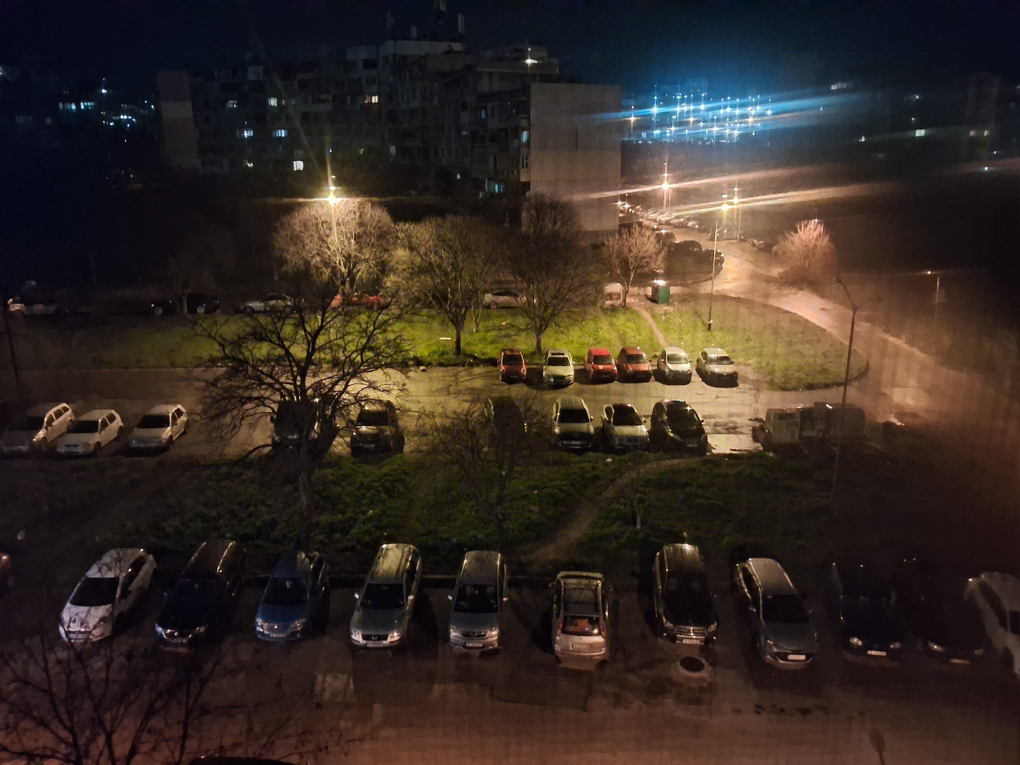 This image depicts a nighttime scene from an elevated perspective, likely a high-floor window, overlooking a residential area in Varna, Bulgaria. The environment is characterized by a mix of multi-story apartment buildings, green spaces, paved roads, and multiple informal parking areas. In the background, several large, utilitarian multi-story residential buildings are visible, with scattered illuminated windows indicating occupied units. A prominent, light-colored, block-like building stands out among darker structures. The sky is dark, showing no stars, but exhibits a blue-ish hue in the upper right, possibly from light pollution or atmospheric conditions. Intense lens flare emanates from bright light sources, likely distant streetlights or building lights, creating prominent blue streaks and starburst effects across the upper right portion of the frame. The middle ground features a network of asphalt or paved roads and pathways, partially illuminated by numerous yellow-orange streetlights on tall poles. Several bare-branched deciduous trees, indicative of late autumn or winter, are scattered across grassy areas. These grassy patches appear somewhat unkempt in places. Numerous vehicles are parked throughout the scene. In the foreground, a row of approximately eight cars is parked parallel to a dark, unseen structure, likely a building or wall. These cars include a white station wagon, a dark sedan, a light-colored sedan, a silver station wagon, a dark-colored SUV, a light-colored SUV, and a dark-colored SUV. A circular manhole or drain cover is visible on the ground near the center foreground. Further back, on the green spaces and informal parking areas, additional vehicles are parked. A cluster of five cars—four red/dark-colored, one light-colored—is visible near the center. More cars are parked along the curved roads and in other green areas. A light-colored dumpster or waste container is visible near a streetlight in the mid-right. No individuals are visible within the depicted scene. The overall impression is one of a quiet, urban residential area during the night, illuminated by artificial light sources.