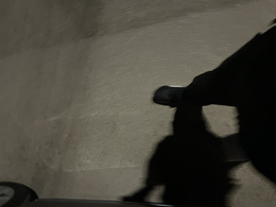 The scene depicts an outdoor environment in Montana, Bulgaria, under low-light conditions. A single individual's left foot, wearing a dark athletic shoe with a white sole accent, is visible in the mid-right portion of the frame, positioned above a textured, light grey paved surface, likely asphalt or concrete. A prominent, elongated dark shadow, consistent with a human form, extends from the lower-left to the center of the image, cast by an unseen light source behind the individual. To the far left, a partial view of a dark vehicle is visible, including a portion of a tire or wheel. The overall impression is of a person walking or standing on a street or pathway at night.