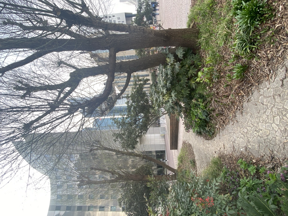 The image displays an urban landscape within Puteaux, France, featuring a green space adjacent to a modern built environment under an overcast sky. In the foreground, a winding path constructed from irregular, light-colored flagstones or cobblestones traverses from the bottom center, curving towards the mid-left. This path is bordered by dense vegetation: to the left, green bushes with small red berries and other low-lying plants are visible, while to the right, a mix of leaf litter and emerging green ground cover, including broad-leafed plants, surrounds the base of large trees. Several deciduous trees with bare, heavily pruned or pollarded branches rise from the mid-ground, extending upwards and across the frame. A notable multi-trunked tree on the right side features a distinctive horizontal branch connecting two of its main trunks. Beyond the green space, a wide, open paved plaza is visible, hosting a wooden bench-like structure on its left side and several metal barriers further back. Approximately five to seven indistinct human figures are observed walking across this plaza in the mid-distance, generally moving from left to right. The background is dominated by modern high-rise buildings; a prominent structure with a curved, reflective facade is visible on the left, and another tall building with blue-tinted windows stands to its right.