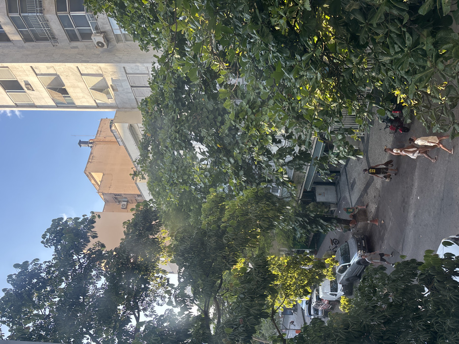 An elevated street scene shows people walking along a sidewalk, some carrying skateboards. Lush green trees overhang the street, partially obscuring buildings in the background. A mix of parked cars and a scooter line the street. Bright sunlight filters through the trees, creating dappled lighting. The perspective suggests the photo was taken from a high vantage point, like a balcony or upper-story window.