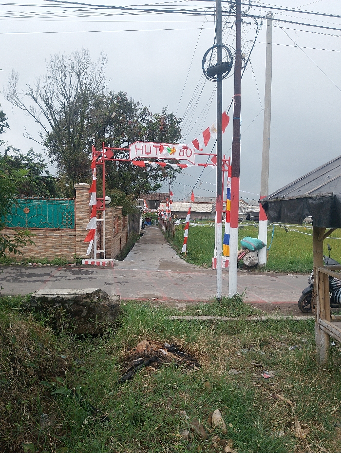 The image displays an outdoor scene in Ciwalen, Indonesia, under an overcast sky. A paved path extends from the foreground into the background, flanked by overgrown grass and debris on both sides. In the mid-ground, a red and white painted archway spans the path, adorned with a banner that reads "HUT RI 80". Red and white flags and bunting are strung across the archway and continue along smaller poles lining the path. To the left of the path, a brick-clad wall with a green metal gate is visible, behind which dense foliage and trees are present. A concrete culvert structure is located in the immediate left foreground. To the right of the path, several utility poles with overhead wires stand, some decorated with red and white. A small, open-sided shelter with a dark roof is situated on the right, with a dark-colored motorcycle parked nearby. Blue and green bundled objects are stacked at the base of a utility pole. Beyond the path and structures, a green field, likely a paddy field, extends into the distance, with distant buildings under the horizon. No individuals are present in the scene.