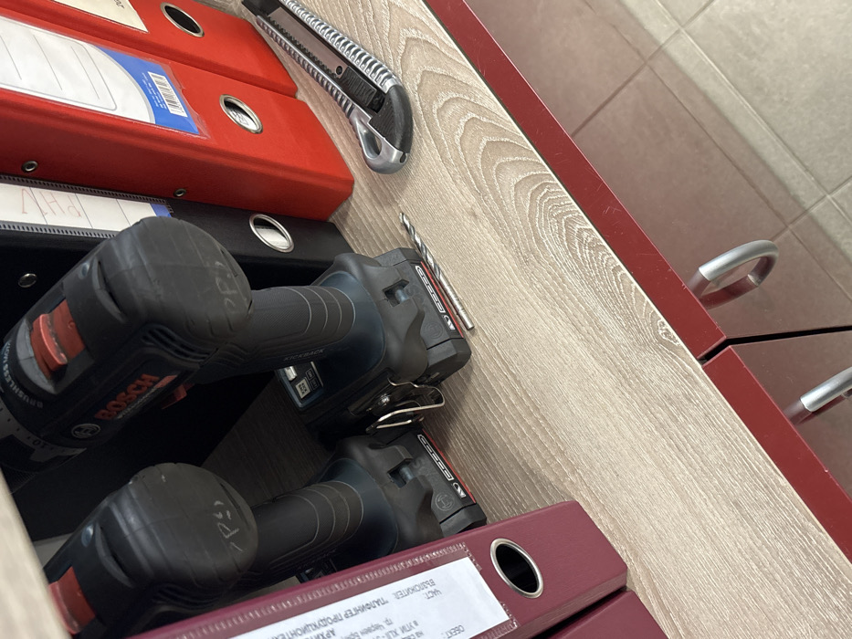 This image captures a close-up view of a storage or work surface within a building in the city of Ruptsi, Bulgaria. The central feature is a light wood-grain shelf upon which various items are arranged. Two black and red Bosch cordless drills stand upright. In front of the drills, two metallic twist drill bits of differing sizes lie horizontally on the shelf. To the immediate left, a burgundy ring binder is partially visible, displaying Cyrillic text, including "ОБЕКТ:" and "ЧАСТ", on its spine. Behind the drills, a black ring binder with the marking "PH2" and two red ring binders are positioned vertically. A silver and black utility knife rests on the right side of the shelf. Below the shelf, two red cabinet doors, each fitted with a silver arched handle, are visible. The floor beneath the cabinet appears to be light-colored tile. No people are present in the scene.
