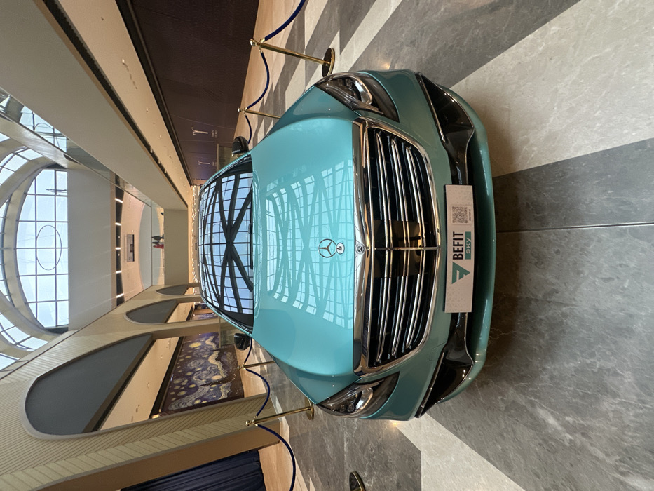 The image depicts the interior of a modern, multi-story shopping mall, identified as Tashkent City Mall in Tashkent, Uzbekistan. A teal-colored Mercedes-Benz sedan is centrally positioned in the foreground, facing the viewer. The car features a prominent chrome grille, a Mercedes-Benz emblem on the hood, and a white rectangular plate on its lower front bumper displaying the "BEFIT SKY" logo, accompanying text, and a QR code. The vehicle is displayed on a polished light-grey marble floor, sectioned off by gold-colored stanchions connected with blue ropes. The mall's architecture includes a high, arched glass-paneled roof acting as a skylight, whose structural elements are reflected in the car's windshield and roof. On the left side of the scene, a large wall mural resembling Vincent van Gogh's "The Starry Night" is visible behind light-colored, vertically grooved architectural arches. On the right, a dark wall displays a subtle "T" logo. Upper levels of the mall, complete with glass railings, are visible in the background. Two indistinct figures are faintly visible on an upper-level walkway in the distant background. The space is illuminated by a combination of natural light from the skylight and internal artificial lighting. No discernible actions or interactions are taking place involving the visible individuals.
