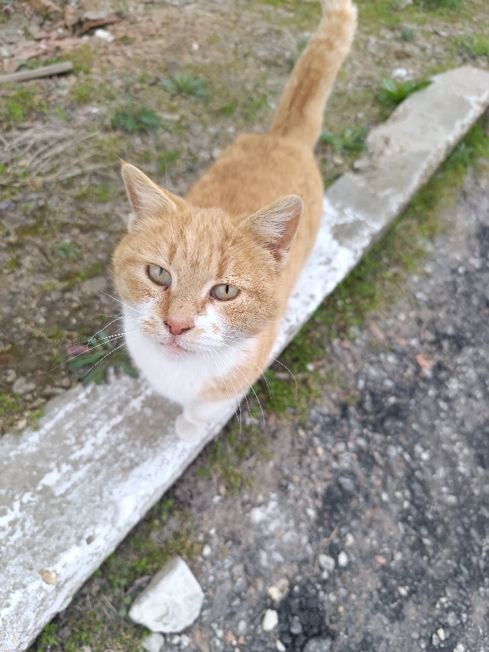 An overhead perspective photograph captures an adult domestic cat standing outdoors in Cherkovitsa, Bulgaria. The cat exhibits a ginger and white coat, with ginger fur covering its back, head, and tail, and white fur on its muzzle, chin, chest, and front paws. Its eyes, a light greenish-yellow hue, are directed upwards, engaging the camera. Distinct white whiskers protrude from its muzzle. The cat is positioned with its front paws resting on a weathered, light grey concrete curb that spans diagonally across the frame from the lower-left to the upper-right. The ground immediately to the left of the curb consists of earth with sparse green vegetation and scattered small pebbles. To the right of the curb, the surface is dark, granular, and indicative of asphalt or compacted gravel. A solitary small, light-colored stone is visible on the ground below the curb, slightly to the left of the cat's midsection.