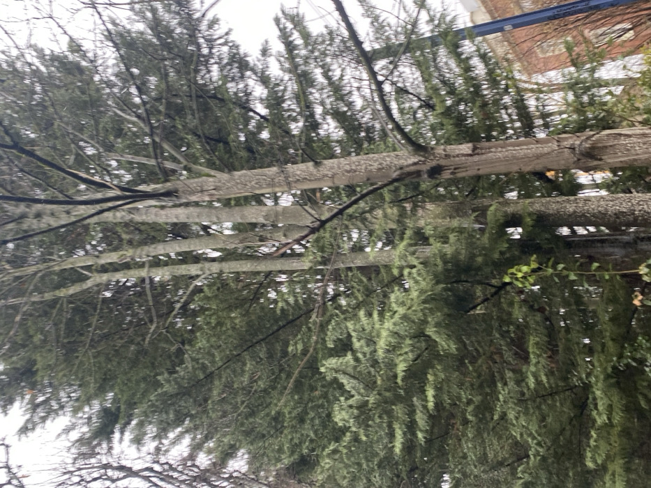 The image presents an outdoor scene dominated by arboreal subjects under an overcast sky in Saint-Cloud, France. Multiple trees occupy the foreground and midground. In the central and right portions, several deciduous trees with light grey-brown bark and visible branch structures are present, exhibiting vertical fissures and dark markings on their trunks. Densely packed evergreen trees with dark green foliage are positioned behind and interspersed among the deciduous trees, primarily on the left and center. At the lower center-right, ground-level green foliage and a slender sapling with light green leaves are visible. The upper background consists of a uniformly light grey, overcast sky. To the far right, a segment of a brick-colored building with multiple rectangular windows is partially visible through the tree canopy. A distinct vertical blue object, consistent with a pole or structural element, is positioned in the far right foreground, partially obscuring the building. No human subjects or discernible actions are present.