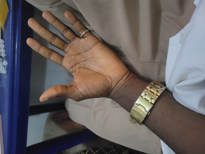 The image displays the left hand and forearm of a dark-skinned individual