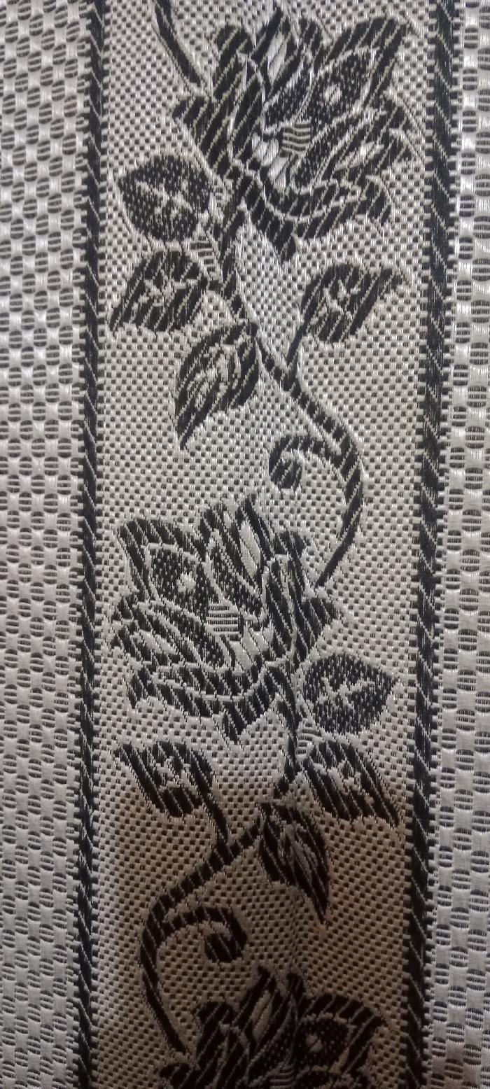 - "The image displays a close-up, vertical orientation of a woven textile, featuring a repeating floral pattern rendered in black and light grey/off-white" by FM-kpMpD2, licensed under CC BY 4.0